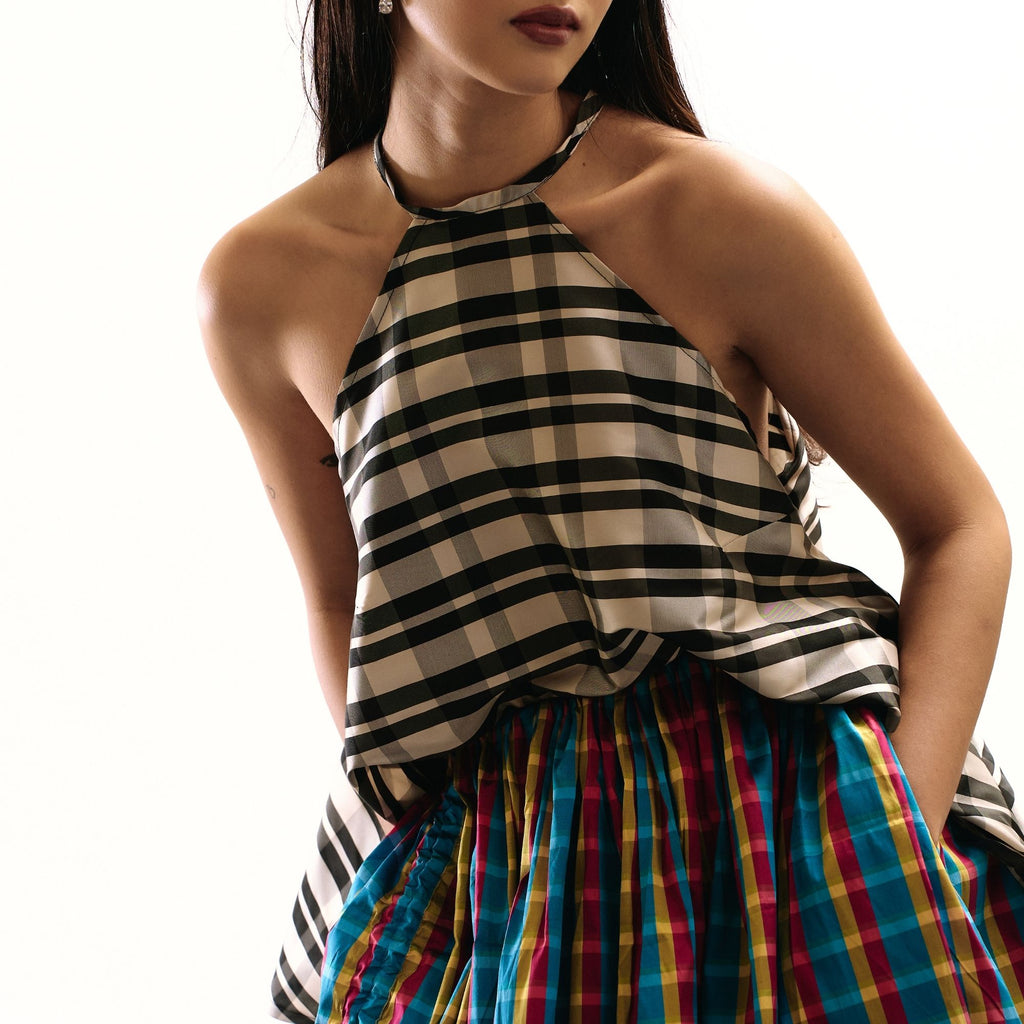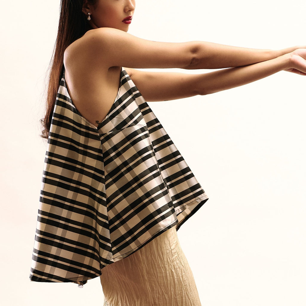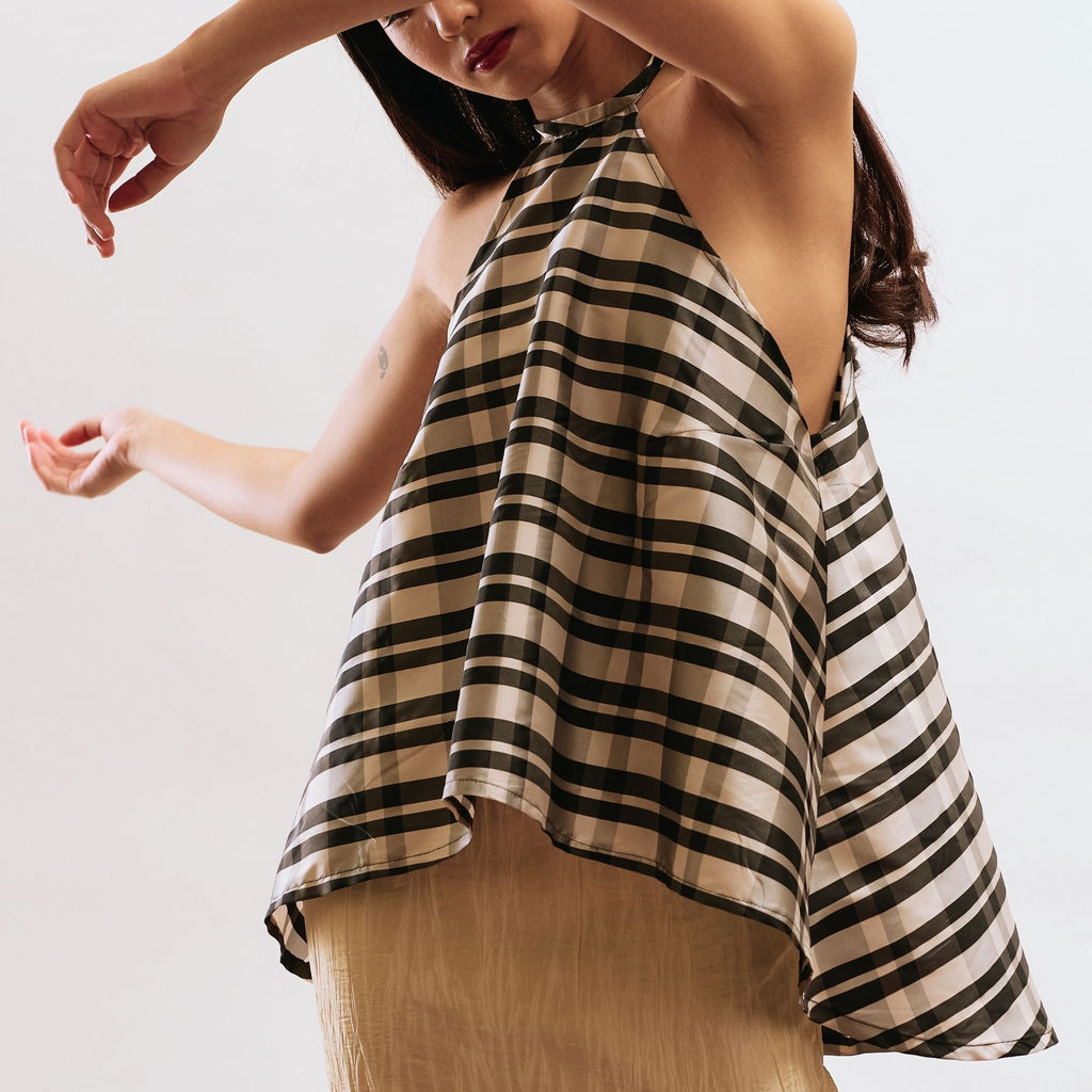 This halter top is crafted from nylon taffeta, designed for both ease and elegance. Perfect for holiday get-togethers or casual everyday wear with a touch of chic. Also available in Plaster and Coal.